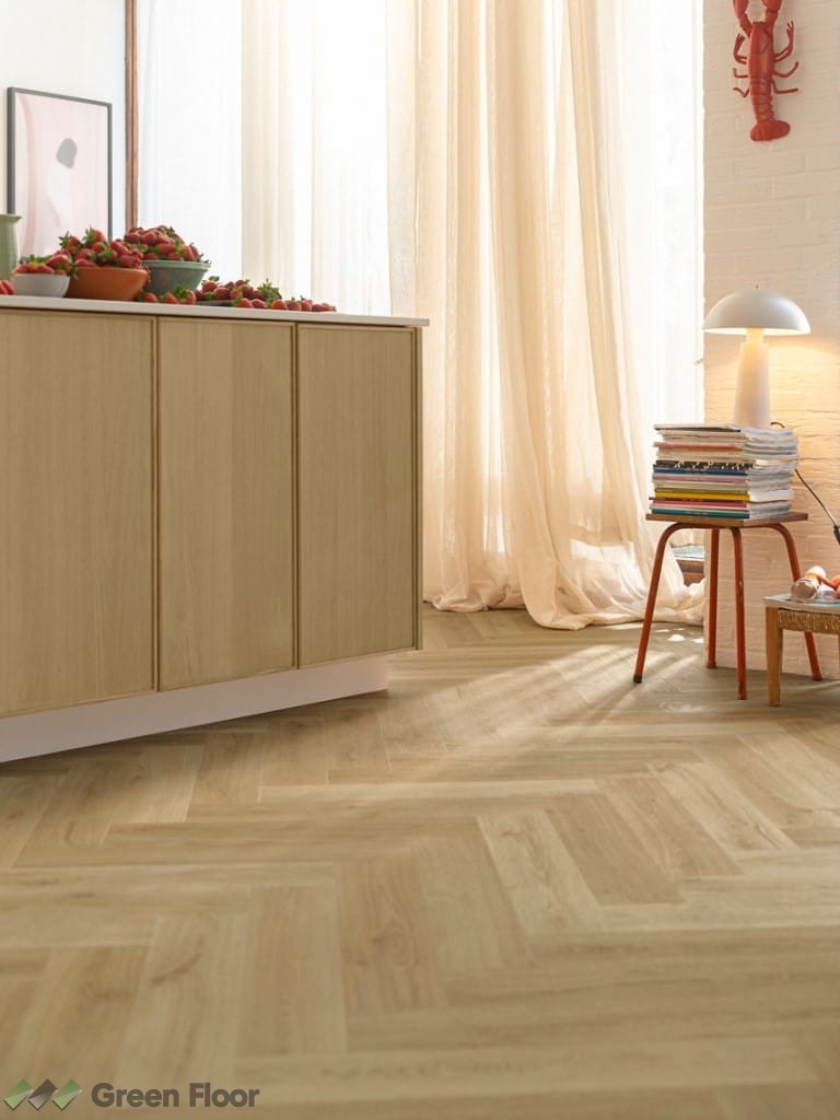 Botaniczny Beż AVHBU40362 z kolekcji Quick-Step Alpha Ciro to rewolucyjne rozwiązanie podłogowe łączące styl, wygodę, trwałość i spokój ducha. Dzięki zastosowaniu innowacyjnego zamka Unizip, zintegrowanego podkładu, wodoszczelnych połączeń oraz dodatkowej ochrony przed zarysowaniami otrzymujemy oszałamiającą podłogę w jodełkę, która jest trwała, łatwa w montażu, wodoodporna i zapewnia wyjątkowy komfort. Zmodernizuj swój dom za pomocą rozwiązania podłogowego, które przekracza oczekiwania.