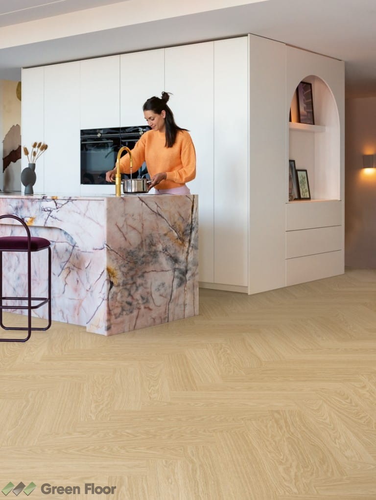 Hydrofobowa powłoka w połączeniu z wodoszczelnym systemem zatrzaskowym dają podłodze całkowitą wodoodporność. To właśnie dlatego podłogi winylowe Quick-Step Alpha Vinyl są nie tylko łatwe do sprzątania, ale także stanowią najlepszy wybór do kuchni, łazienek i innych stref narażonych na wilgoć.